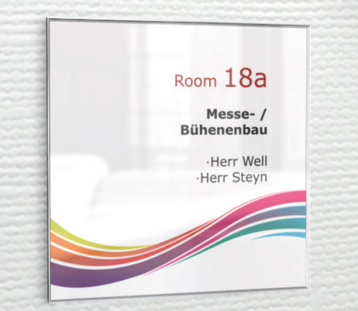 ![]() Edelstahlkassette. Mittels eines Saugnapfs ist der Wechsel des Einlegers extrem einfach. Die Montage ist einfach. Sie erfolgt entweder durch Verschraubung durch die gestanzten Schraubaugen auf der Wand oder aber durch Verklebung auf den verschiedensten Materialien. Durch die Erhebung der Schraubaugen um ca. 3 mm entsteht eine attraktive Schattennut, da die Kassette nicht direkt auf der Wand aufliegt. Die Schilder sind in 14 Formaten ( hochkant oder quer ) lieferbar. Echtglas* ESG (EinscheibenSicherheitsGlas) ![]() cassette. Changing the insert is extremely easy thanks to a suction cup. Installation is straightforward. It is done either by screwing it into the wall using the punched screw holes or by gluing it to a variety of materials. Raising the screw holes by approximately 3 mm creates an attractive shadow groove, as the cassette does not rest directly on the wall. The signs are available in 14 formats (portrait or landscape). Real glass* ESG (Tempered safety glass) |
